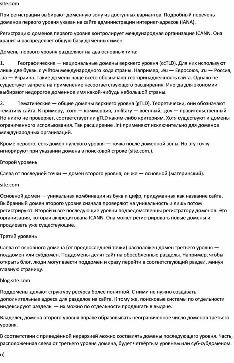 Основной домен — уникальная комбинация из букв и цифр, придуманная как название сайта. Выбранный домен второго уровня сначала проверяют на уникальность и лишь потом регистрируют. Второй и все последующие уровни подведомственны регистратору доменов. Это организация, которая аккредитована ICANN. Она может регистрировать новые домены и продлевать уже существующие.