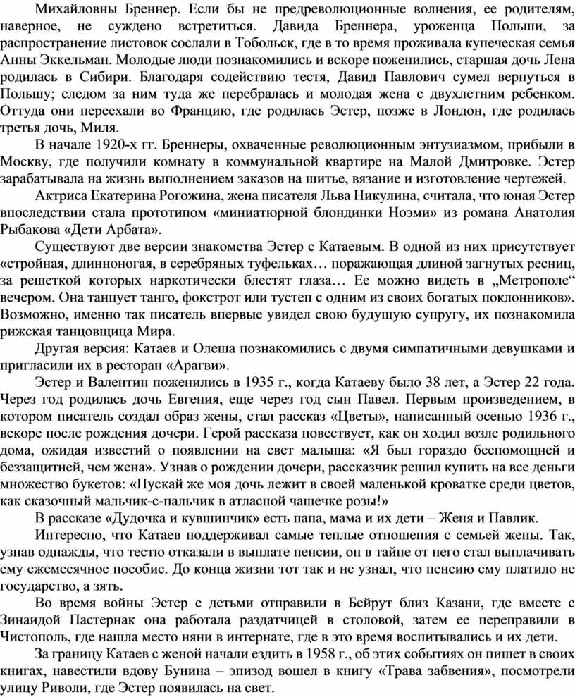 Эстер и Валентин поженились в 1935 г., когда Катаеву было 38 лет, а Эстер 22 года. Через год родилась дочь Евгения, еще через год сын Павел. Первым произведением, в котором писатель создал образ жены, стал рассказ «Цветы», написанный осенью 1936 г., вскоре после рождения дочери. Герой рассказа повествует, как он ходил возле родильного дома, ожидая известий о появлении на свет малыша: «Я был гораздо беспомощней и беззащитней, чем жена». Узнав о рождении дочери, рассказчик решил купить на все деньги множество букетов: «Пускай же моя дочь лежит в своей маленькой кроватке среди цветов, как сказочный мальчик-с-пальчик в атласной чашечке розы!»