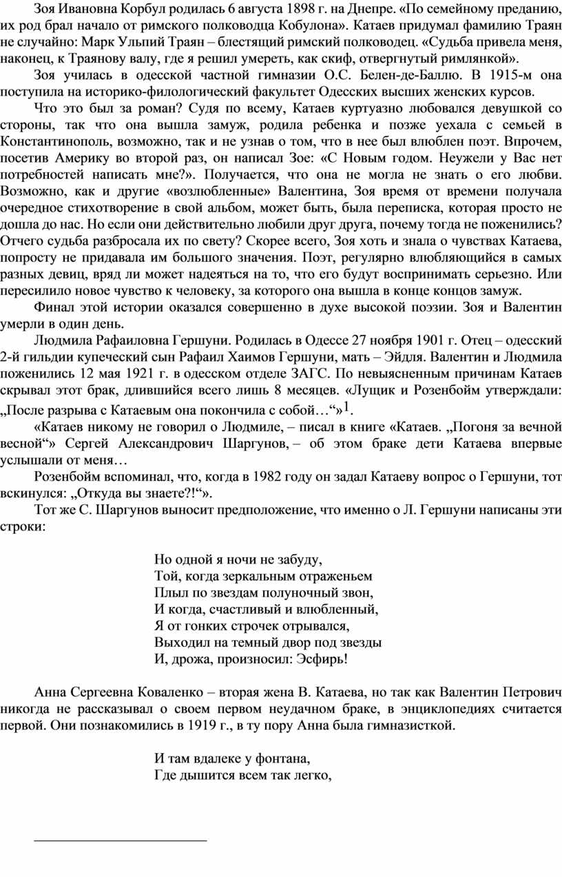 Зоя Ивановна Корбул родилась 6 августа 1898 г. на Днепре. «По семейному преданию, их род брал начало от римского полководца Кобулона». Катаев придумал фамилию Траян не случайно: Марк Ульпий Траян – блестящий римский полководец. «Судьба привела меня, наконец, к Траянову валу, где я решил умереть, как скиф, отвергнутый римлянкой».