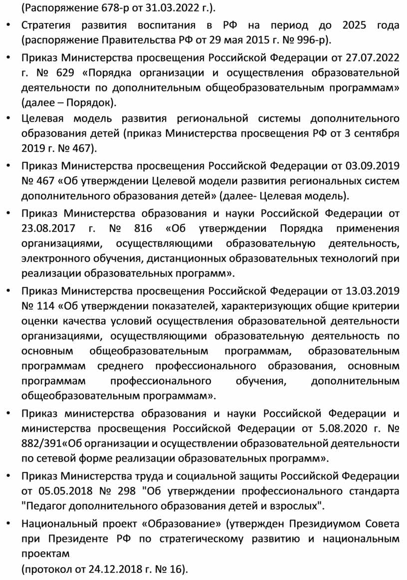 • Приказ Министерства просвещения Российской Федерации от 27.07.2022 г. № 629 «Порядка организации и осуществления образовательной деятельности по дополнительным общеобразовательным программам» (далее – Порядок).
