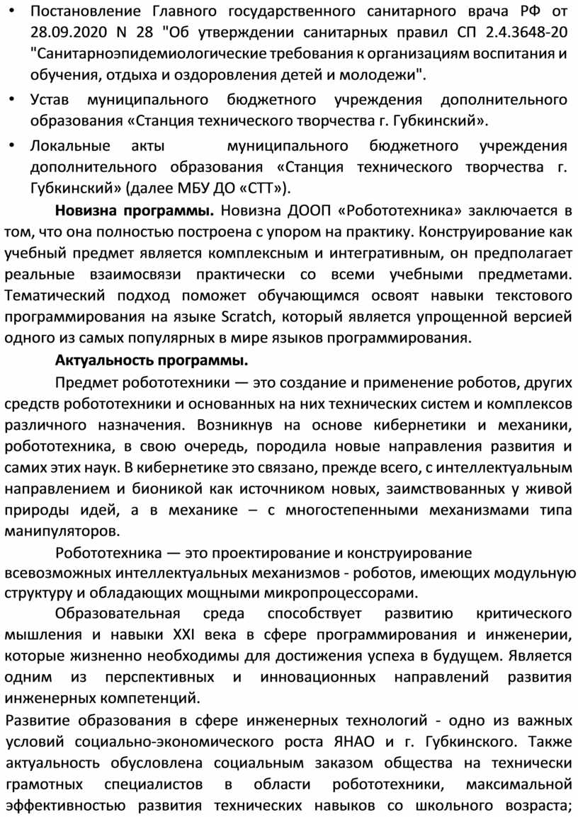 Новизна программы. Новизна ДООП «Робототехника» заключается в том, что она полностью построена с упором на практику. Конструирование как учебный предмет является комплексным и интегративным, он предполагает реальные взаимосвязи практически со всеми учебными предметами. Тематический подход поможет обучающимся освоят навыки текстового программирования на языке Scratch, который является упрощенной версией одного из самых популярных в мире языков программирования.