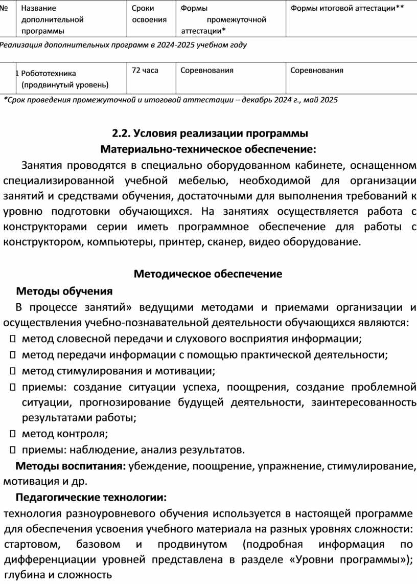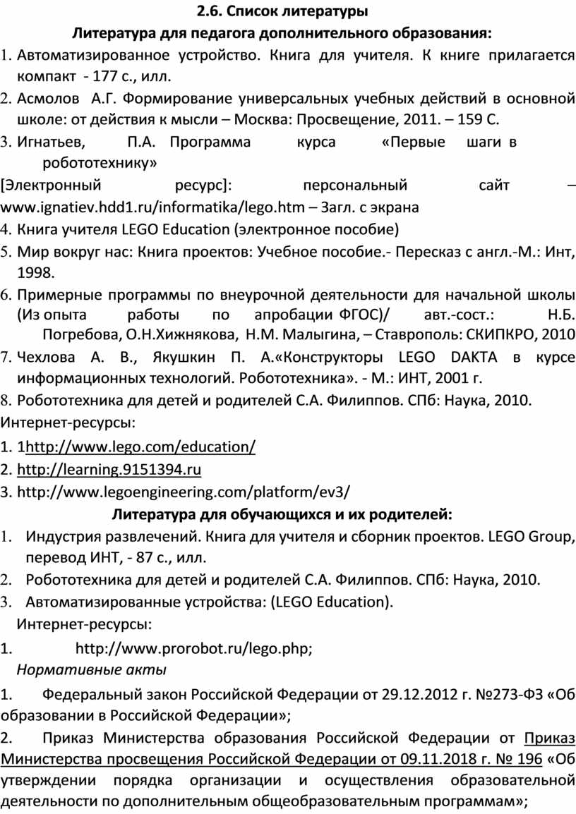 Программа ориентирована на применение широкого комплекса различного дополнительного материала, а именно: видеоматериалы, использование программного обеспечения такого как: Lego Mindstorms Education EV3 Classroom и Lego Digital Designer.