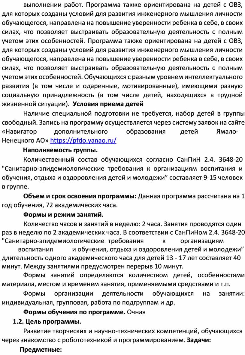 Программа рассчитана на обучающихся системы дополнительного образования в возрасте 13-17 лет. В данном возрасте преобладает авторитет педагога. Дети способны под руководством взрослого определять цель задания, планировать алгоритм его выполнения, это дает возможность доводить дело до конца, добиваться поставленной цели. Также дети проявляют фантазию и воображение, что позволяет развивать имеющиеся творческие способности, при выполнении работ. Программа также ориентирована на детей с ОВЗ, для которых созданы условий для развития инженерного мышления личности обучающегося, направлена на повышение уверенности ребенка в себе, в своих силах, что позволяет выстраивать образовательную деятельность с полным учетом этих особенностей. Программа также ориентирована на детей с ОВЗ, для которых созданы условий для развития инженерного мышления личности обучающегося, направлена на повышение уверенности ребенка в себе, в своих силах, что позволяет выстраивать образовательную деятельность с полным учетом этих особенностей. Обучающихся с разным уровнем интеллектуального развития (в том числе и одаренные, мотивированные), имеющими разную социальную принадлежность (в том числе детей, находящихся в трудной жизненной ситуации). Условия приема детей