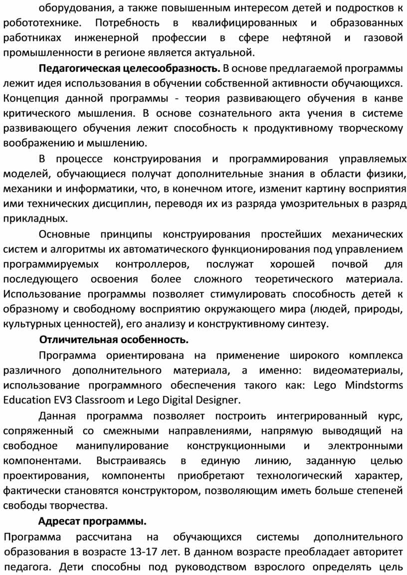 Основные принципы конструирования простейших механических систем и алгоритмы их автоматического функционирования под управлением программируемых контроллеров, послужат хорошей почвой для последующего освоения более сложного теоретического материала. Использование программы позволяет стимулировать способность детей к образному и свободному восприятию окружающего мира (людей, природы, культурных ценностей), его анализу и конструктивному синтезу.