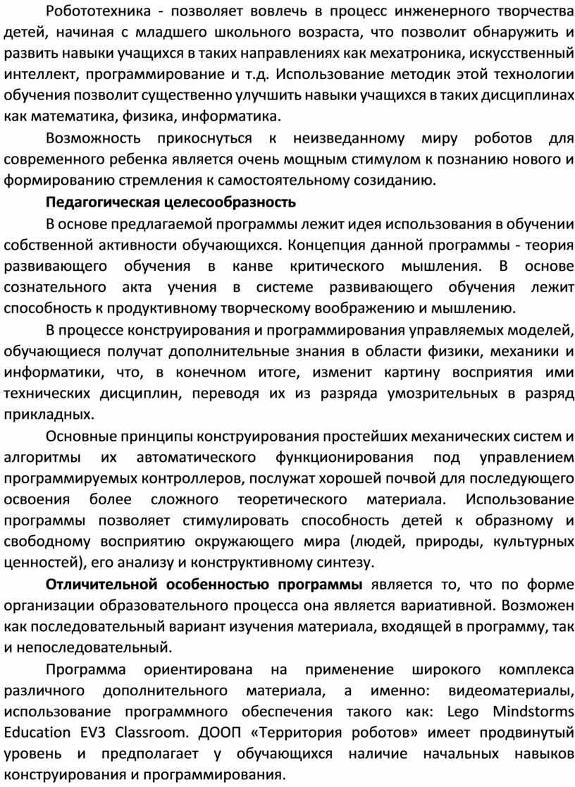 Программа ориентирована на применение широкого комплекса различного дополнительного материала, а именно: видеоматериалы, использование программного обеспечения такого как: Lego Mindstorms Education EV3 Classroom. ДООП «Территория роботов» имеет продвинутый уровень и предполагает у обучающихся наличие начальных навыков конструирования и программирования.