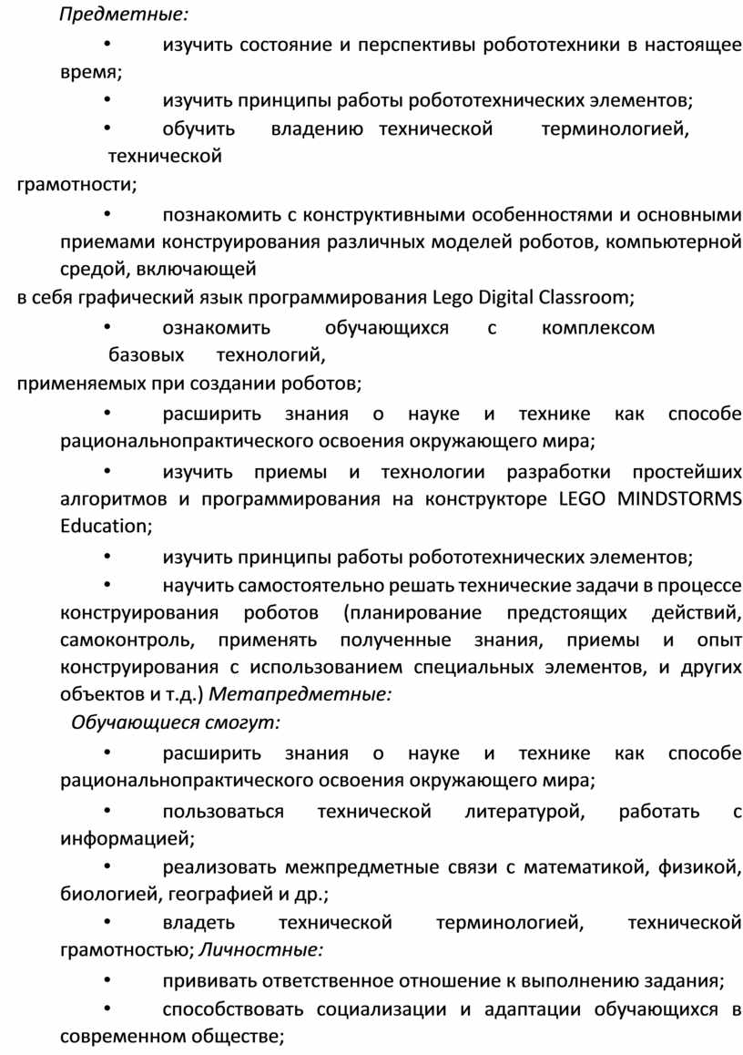 • научить самостоятельно решать технические задачи в процессе конструирования роботов (планирование предстоящих действий, самоконтроль, применять полученные знания, приемы и опыт конструирования с использованием специальных элементов, и других объектов и т.д.) Метапредметные: