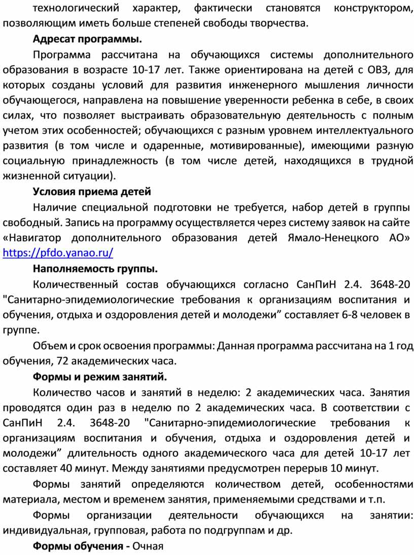 Программа рассчитана на обучающихся системы дополнительного образования в возрасте 10-17 лет. Также ориентирована на детей с ОВЗ, для которых созданы условий для развития инженерного мышления личности обучающегося, направлена на повышение уверенности ребенка в себе, в своих силах, что позволяет выстраивать образовательную деятельность с полным учетом этих особенностей; обучающихся с разным уровнем интеллектуального развития (в том числе и одаренные, мотивированные), имеющими разную социальную принадлежность (в том числе детей, находящихся в трудной жизненной ситуации).