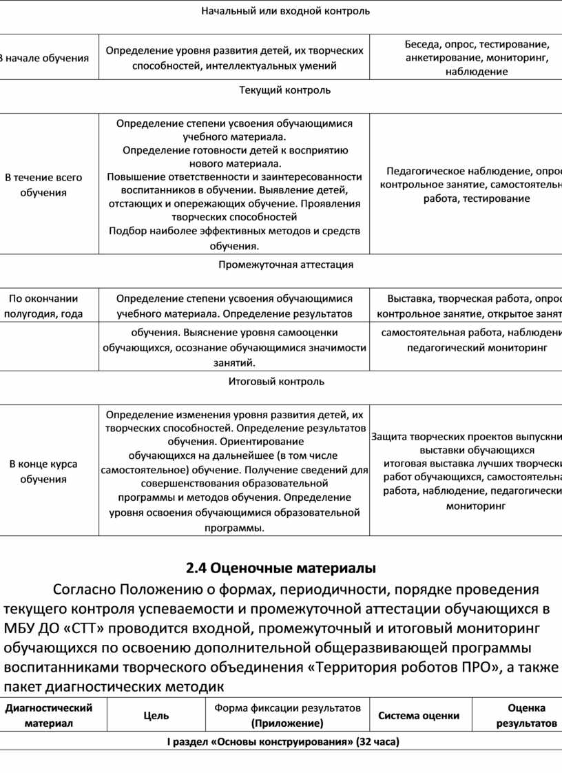 Для выявления уровня усвоения содержания программы и своевременного внесения коррекции в образовательный процесс, проводится текущий контроль в виде промежуточной аттестации в конце каждого года обучения. В течение реализации программы предполагаются регулярные зачеты, на которых решение поставленной заранее известной задачи принимается в свободной форме (не обязательно предложенной преподавателем).