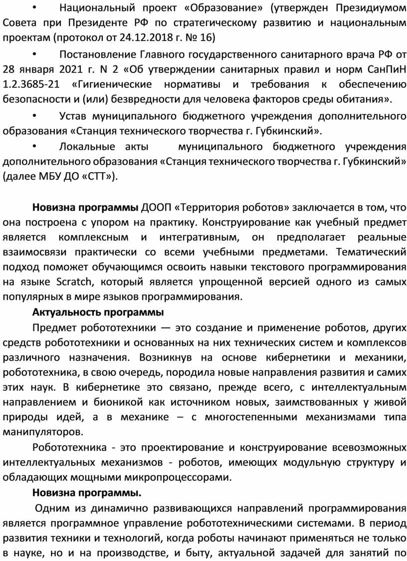 Новизна программы ДООП «Территория роботов» заключается в том, что она построена с упором на практику. Конструирование как учебный предмет является комплексным и интегративным, он предполагает реальные взаимосвязи практически со всеми учебными предметами. Тематический подход поможет обучающимся освоить навыки текстового программирования на языке Scratch, который является упрощенной версией одного из самых популярных в мире языков программирования.
