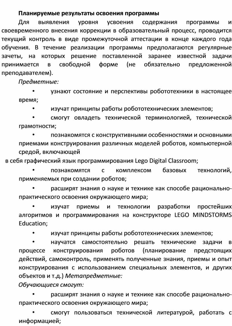 В процессе конструирования и программирования управляемых моделей, обучающиеся получат дополнительные знания в области физики, механики и информатики, что, в конечном итоге, изменит картину восприятия ими технических дисциплин, переводя их из разряда умозрительных в разряд прикладных.