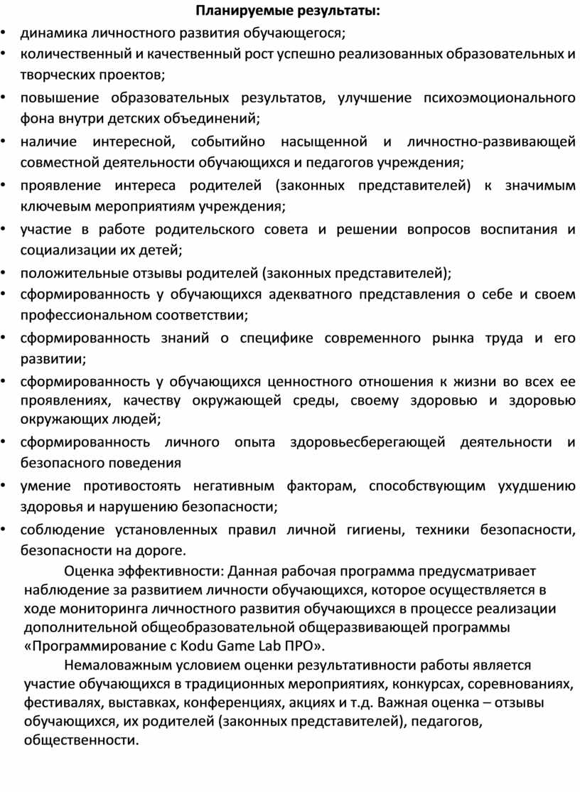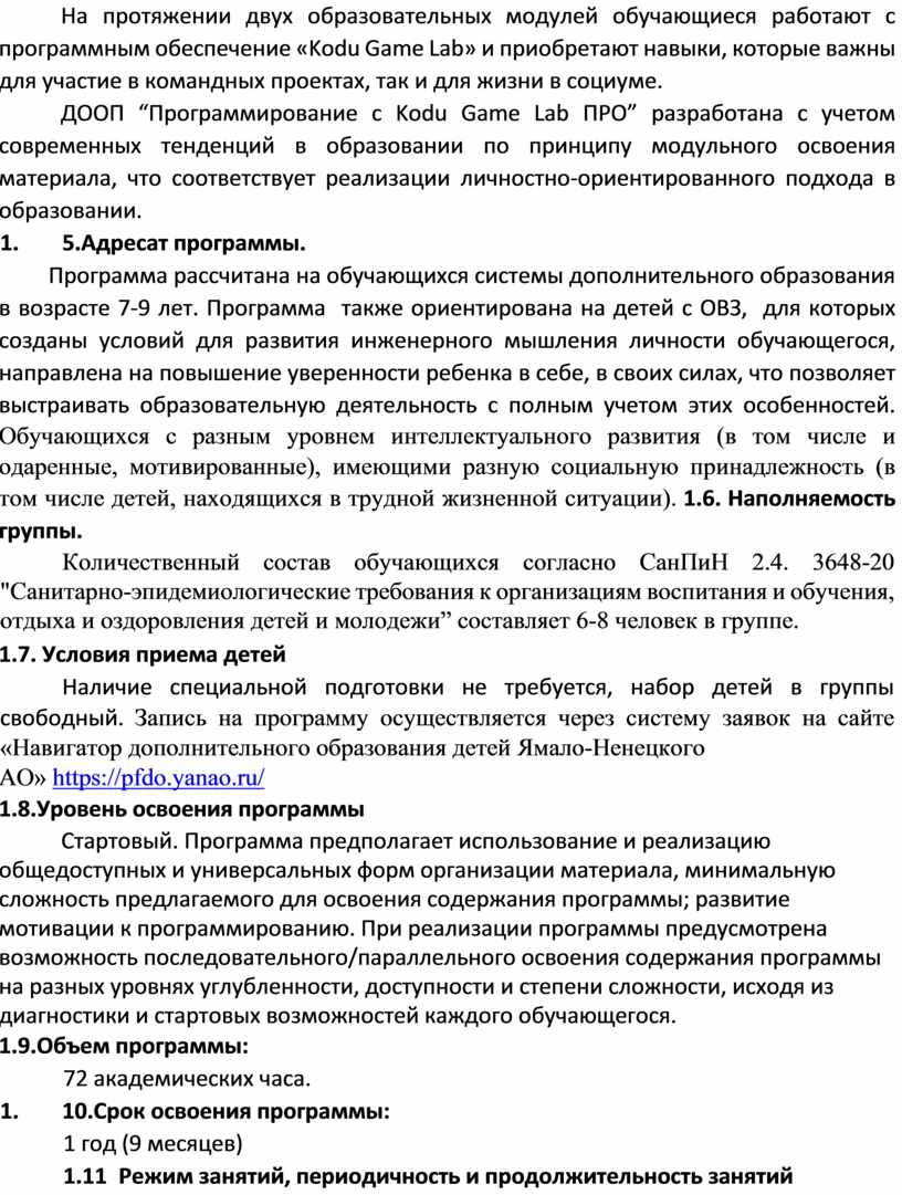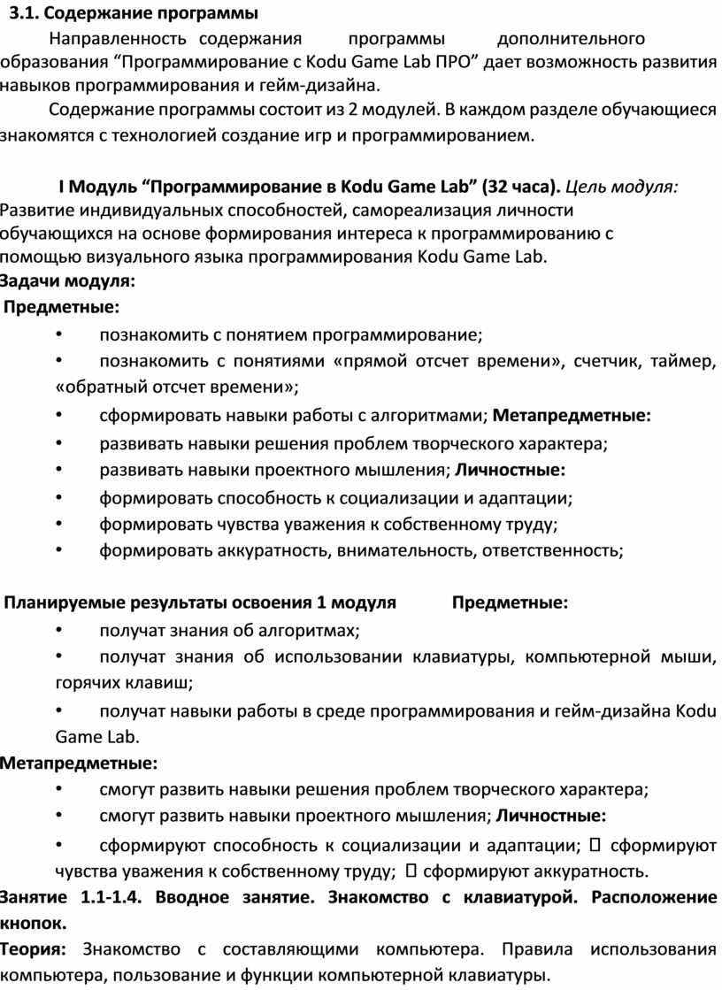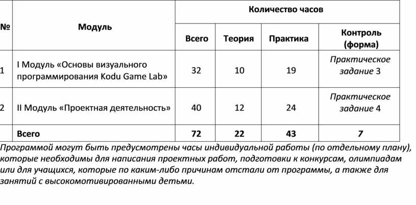 Данная программа является межпредметным модулем, где дети комплексно используют свои знания. ДООП «Программирование с Kodu Game Lab ПРО» включает в себя два модуля: «Основы визуального программирования в Kodu Game Lab» (32 часов), «Проектная деятельность» (40 часов).