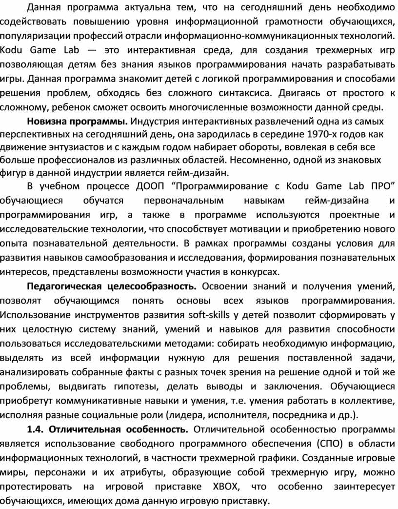 ДООП “Программирование с Kodu Game Lab ПРО” разработана с учетом современных тенденций в образовании по принципу модульного освоения материала, что соответствует реализации личностно-ориентированного подхода в образовании.