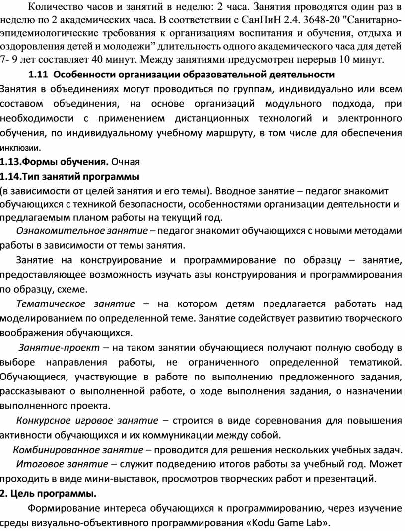 Количество часов и занятий в неделю: 2 часа. Занятия проводятся один раз в неделю по 2 академических часа. В соответствии с СанПиН 2.4. 3648-20 "Санитарно-эпидемиологические требования к организациям воспитания и обучения, отдыха и оздоровления детей и молодежи” длительность одного академического часа для детей 7- 9 лет составляет 40 минут. Между занятиями предусмотрен перерыв 10 минут.