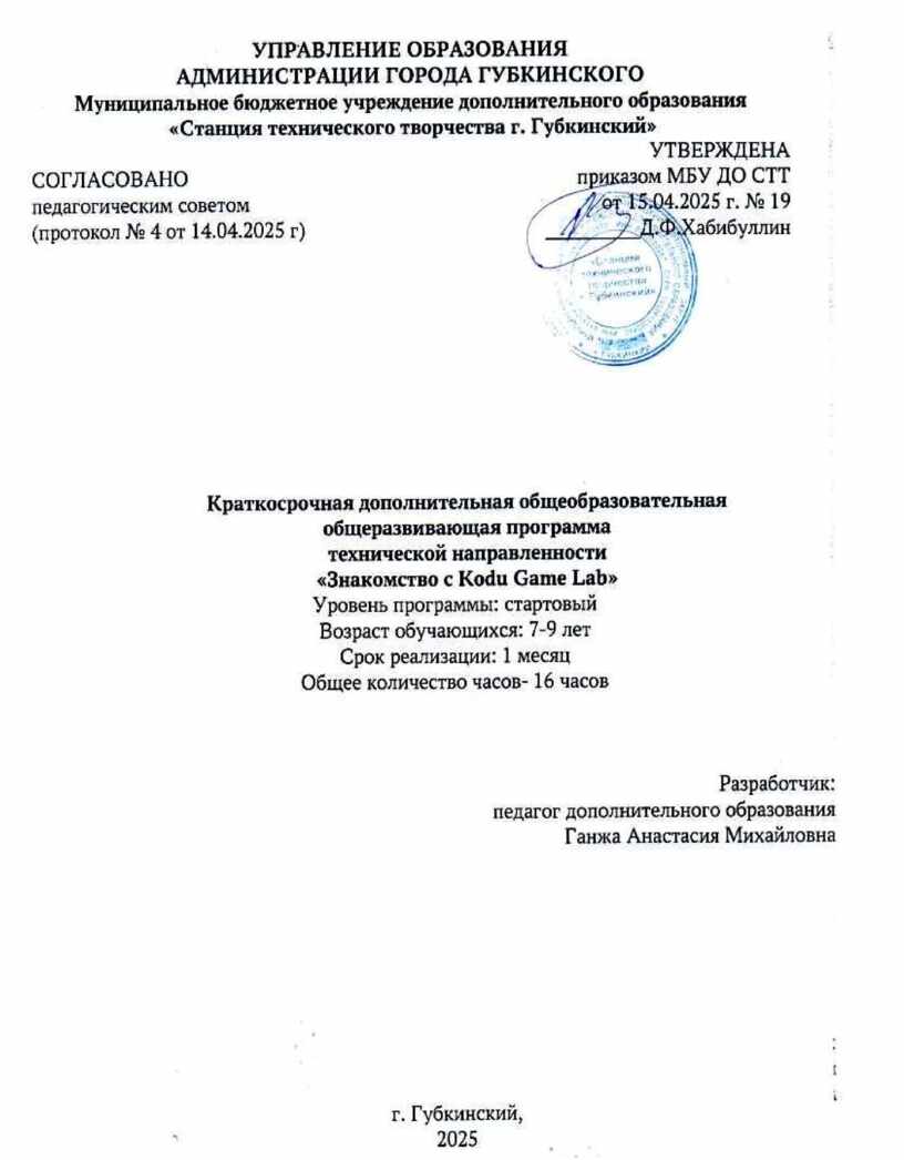 • Устав муниципального бюджетного учреждения дополнительного образования «Станция технического творчества г. Губкинский».