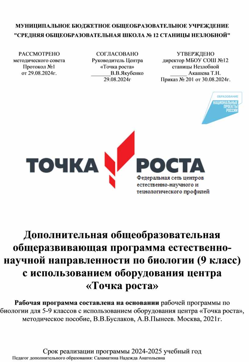 УТВЕРЖДЕНО директор МБОУ СОШ №12 станицы Незлобной ______ Акашева Т.Н. Приказ № 201 от 30.08.2024г.