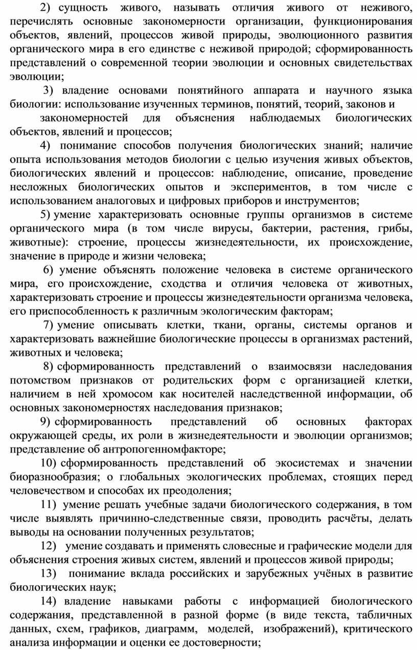 2) умение применять систему биологических знаний: раскрывать сущность живого, называть отличия живого от неживого, перечислять основные закономерности организации, функционирования объектов, явлений, процессов живой природы, эволюционного развития органического мира в его единстве с неживой природой; сформированность представлений о современной теории эволюции и основных свидетельствах эволюции;