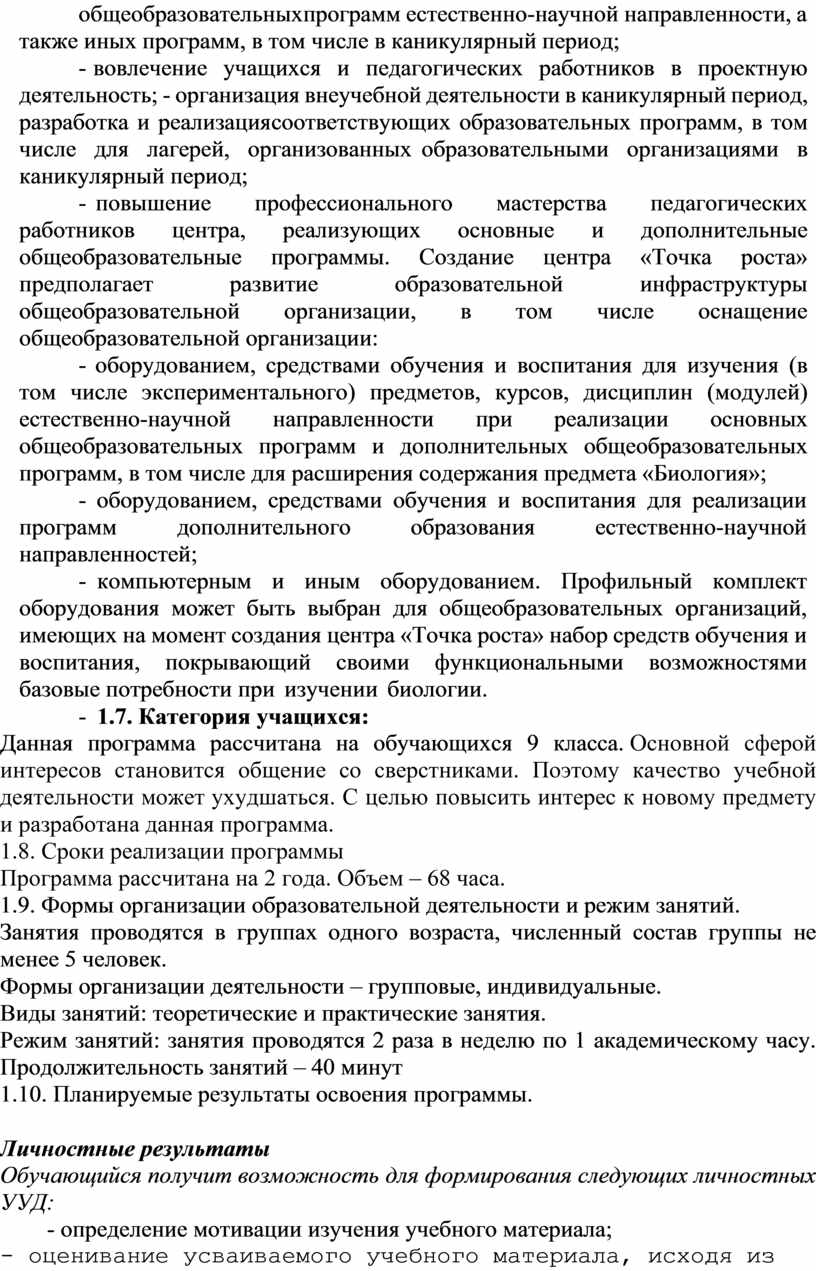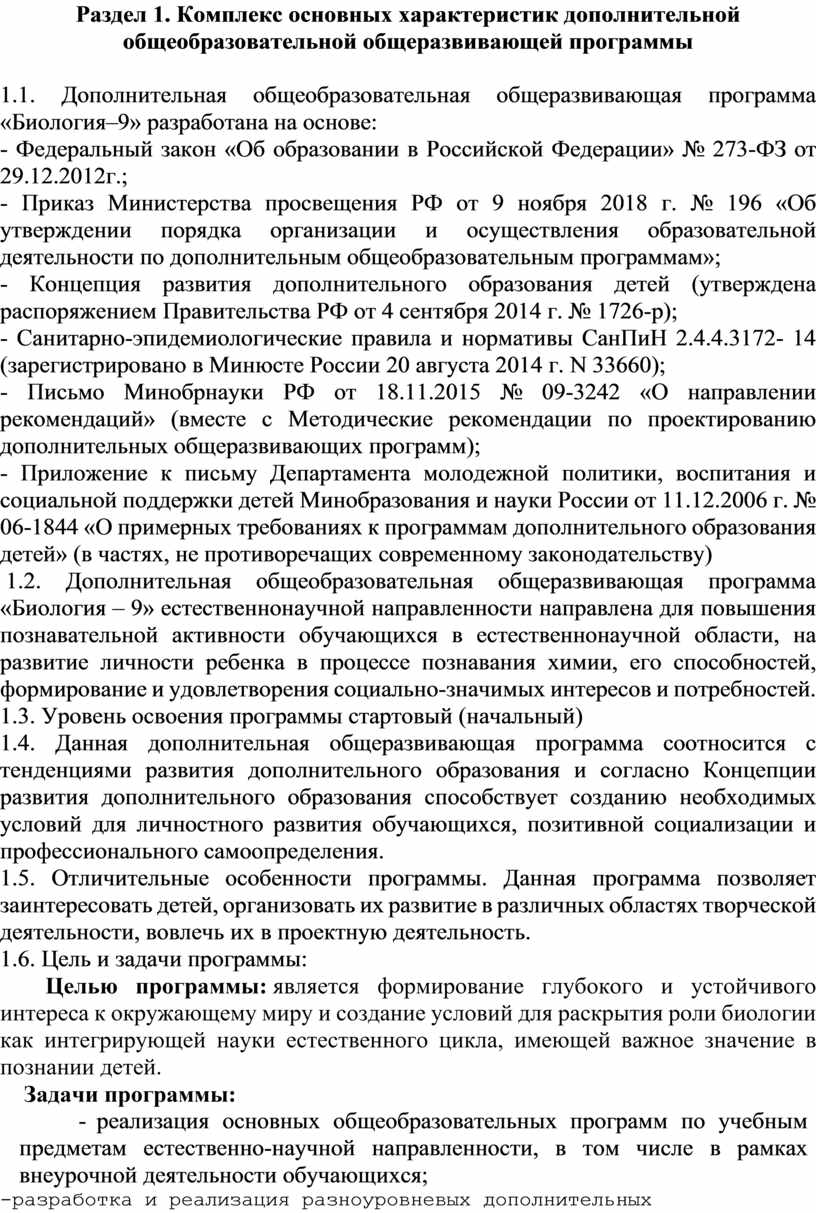 1.2. Дополнительная общеобразовательная общеразвивающая программа «Биология – 9» естественнонаучной направленности направлена для повышения познавательной активности обучающихся в естественнонаучной области, на развитие личности ребенка в процессе познавания химии, его способностей, формирование и удовлетворения социально-значимых интересов и потребностей.