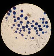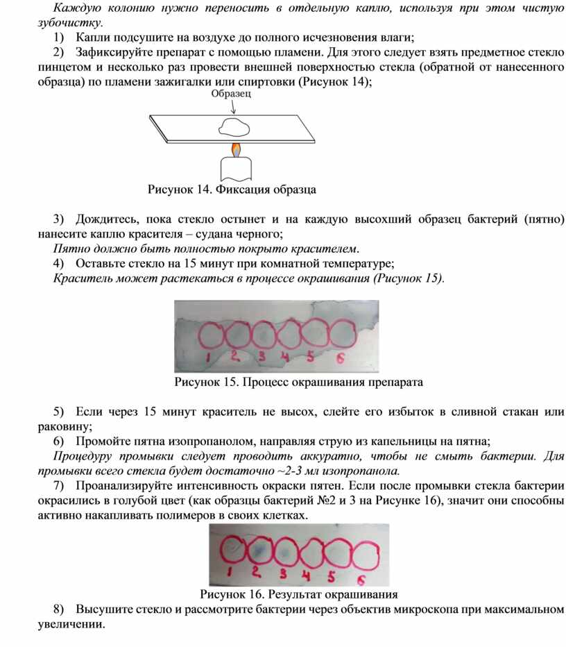 12) Проанализируйте интенсивность окраски пятен. Если после промывки стекла бактерии окрасились в голубой цвет (как образцы бактерий №2 и 3 на Рисунке 16), значит они способны активно накапливать полимеров в своих клетках.