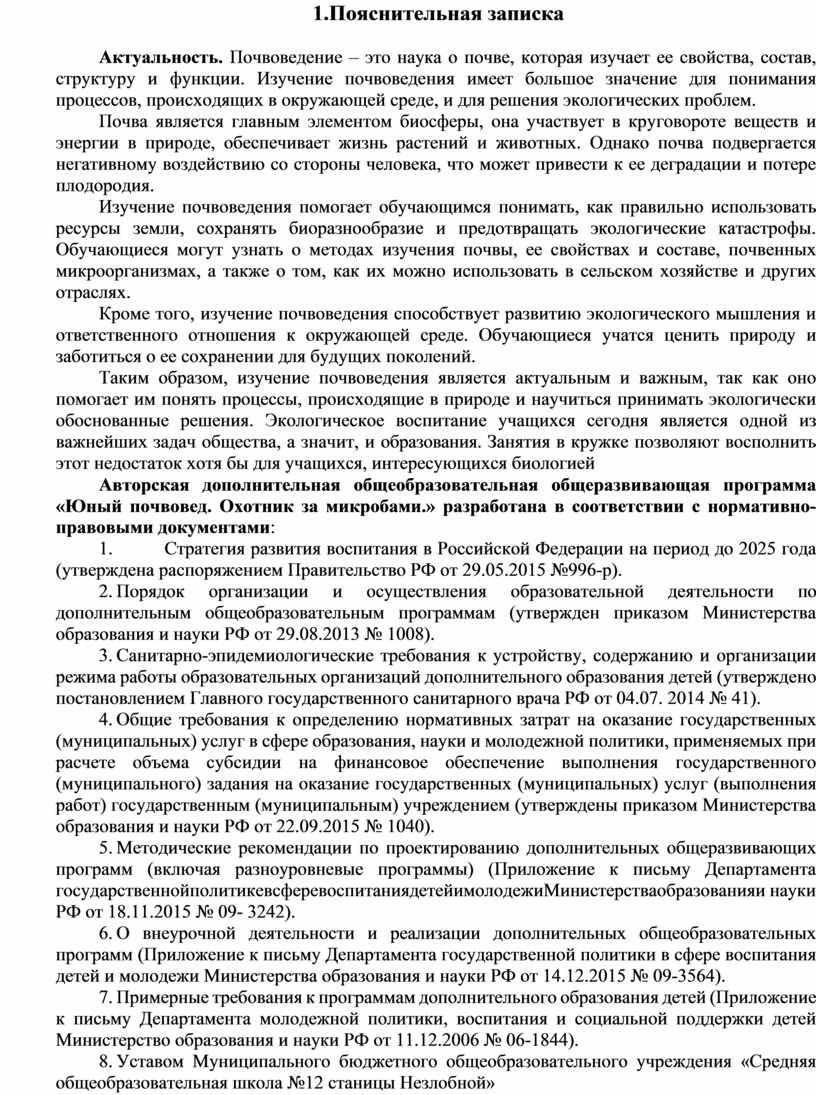Авторская дополнительная общеобразовательная общеразвивающая программа «Юный почвовед. Охотник за микробами.» разработана в соответствии с нормативно-правовыми документами: