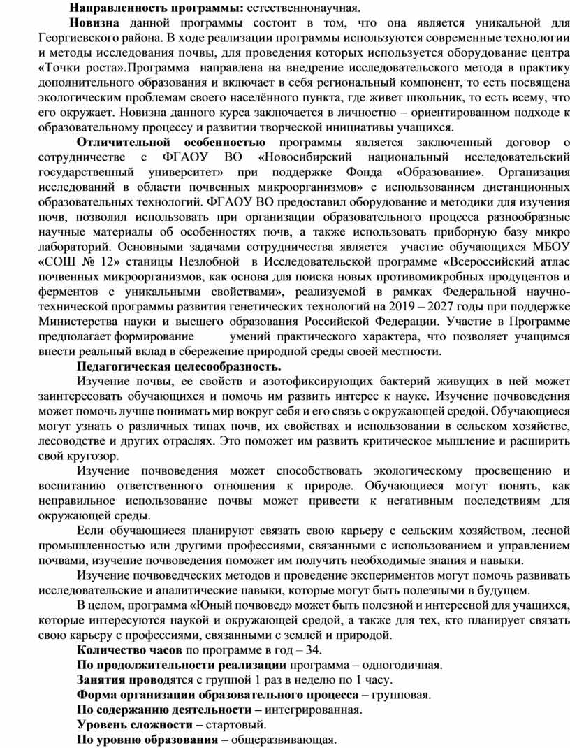В целом, программа «Юный почвовед» может быть полезной и интересной для учащихся, которые интересуются наукой и окружающей средой, а также для тех, кто планирует связать свою карьеру с профессиями, связанными с землей и природой.