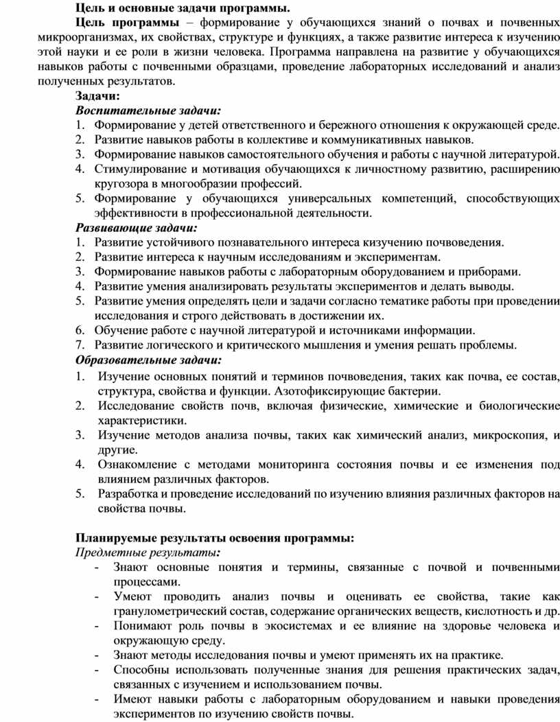 Цель программы – формирование у обучающихся знаний о почвах и почвенных микроорганизмах, их свойствах, структуре и функциях, а также развитие интереса к изучению этой науки и ее роли в жизни человека. Программа направлена на развитие у обучающихся навыков работы с почвенными образцами, проведение лабораторных исследований и анализ полученных результатов.