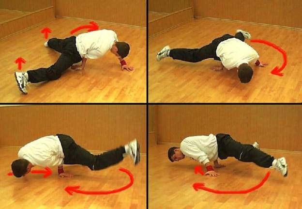 «Черепаха» - горизонтальное вращение тела на согнутых руках. Для начала как минимум нужно научиться стоять на черепахе на одном месте. На обеих руках, затем на левой и на правой. Так же не помешает научиться выполнять элемент “крокодильчик” – это когда обе руки упираются в пресс (локтями), а ноги сложены вместе и вытянуты назад. Тело должно оказаться параллельно полу.