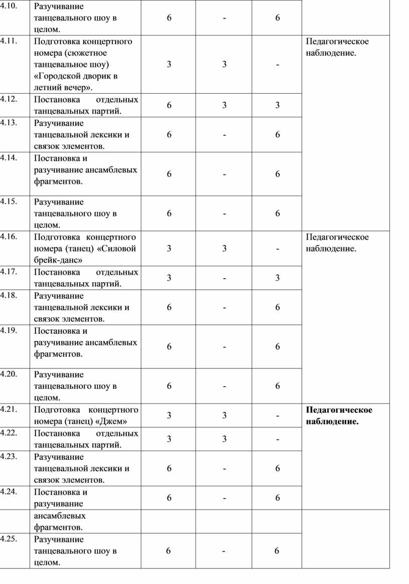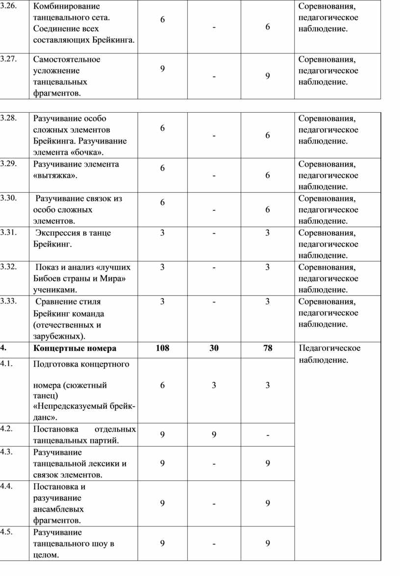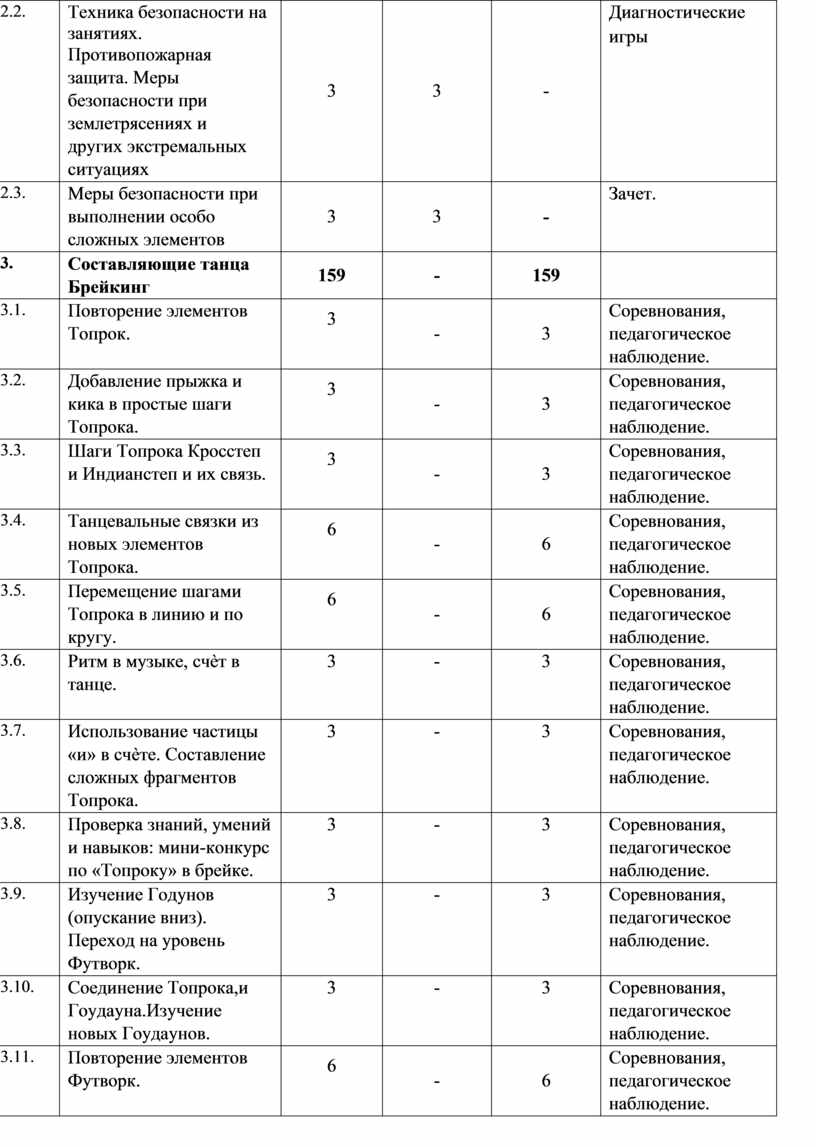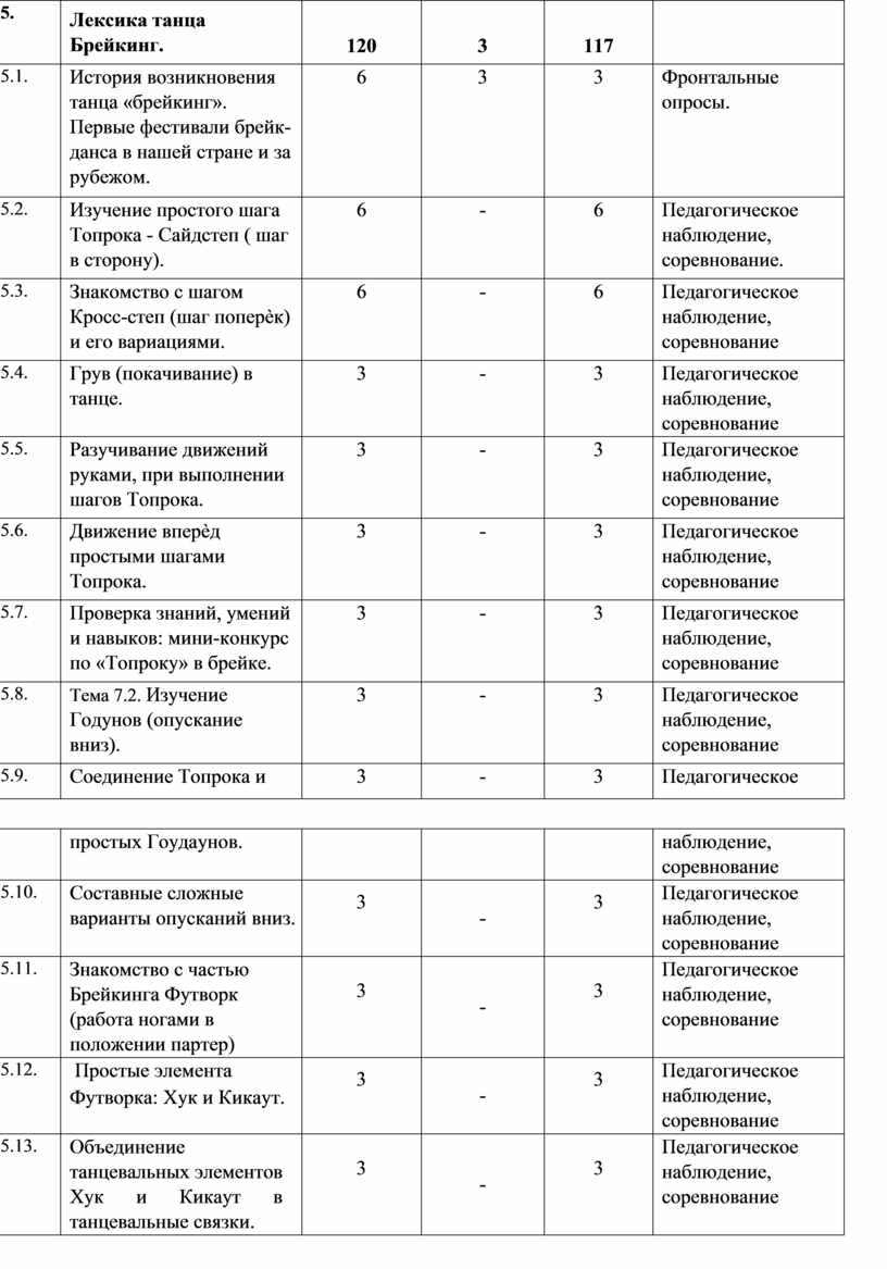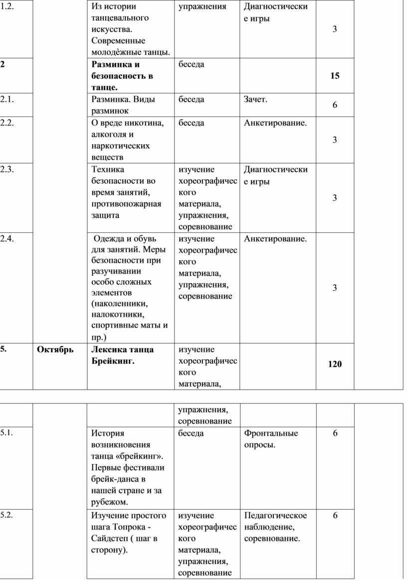 Основное количество учебных часов посвящено практическим занятиям, в том числе, изучению танцевальной лексики, относящейся к хип-хоп культуре. Обучение идет по двум принципам: «от простого к сложному» и «концентрических кругов». Сначала изучаются отдельные элементы, затем элементы собираются в «связки». «Связки» объединяются в танцевальные фрагменты и мини-танцы, затем начинается совместное (педагог совместно с учащимися) увлекательное творчество постановки танца. Существует и некоторое количество тем, которые изучаются на протяжении всех трех лет обучения (по принципу «концентрических кругов»).