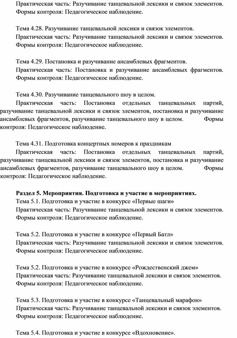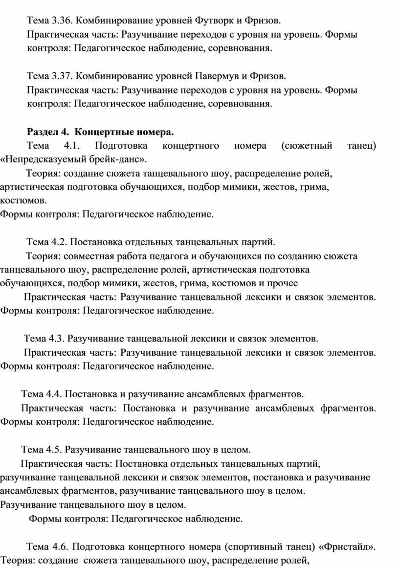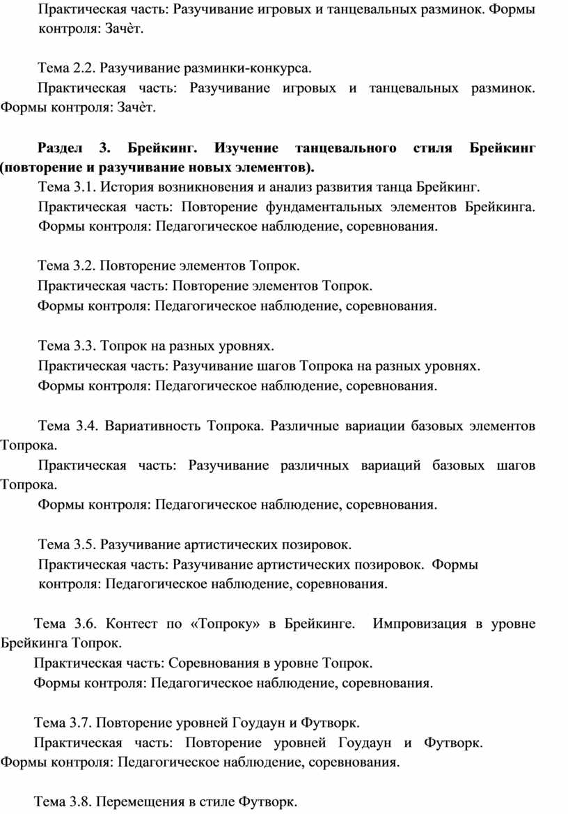 Виды занятий по программе: групповые, индивидуальные. В процессе реализации программы используются разнообразные формы занятий: беседы преподавателя с учащимися, совместное комментирующее изучение хореографического материала, упражнения, соревнование, выбор музыкальных тем для практических занятий, репетиции, экскурсии, творческие поездки, встречи с деятелями танцевальных искусств, просмотр танцевальных битв и выступлений.
