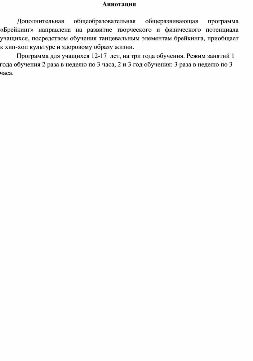 Дополнительная общеобразовательная общеразвивающая программа «Брейкинг» направлена на развитие творческого и физического потенциала учащихся, посредством обучения танцевальным элементам брейкинга, приобщает к хип-хоп культуре и здоровому образу жизни.