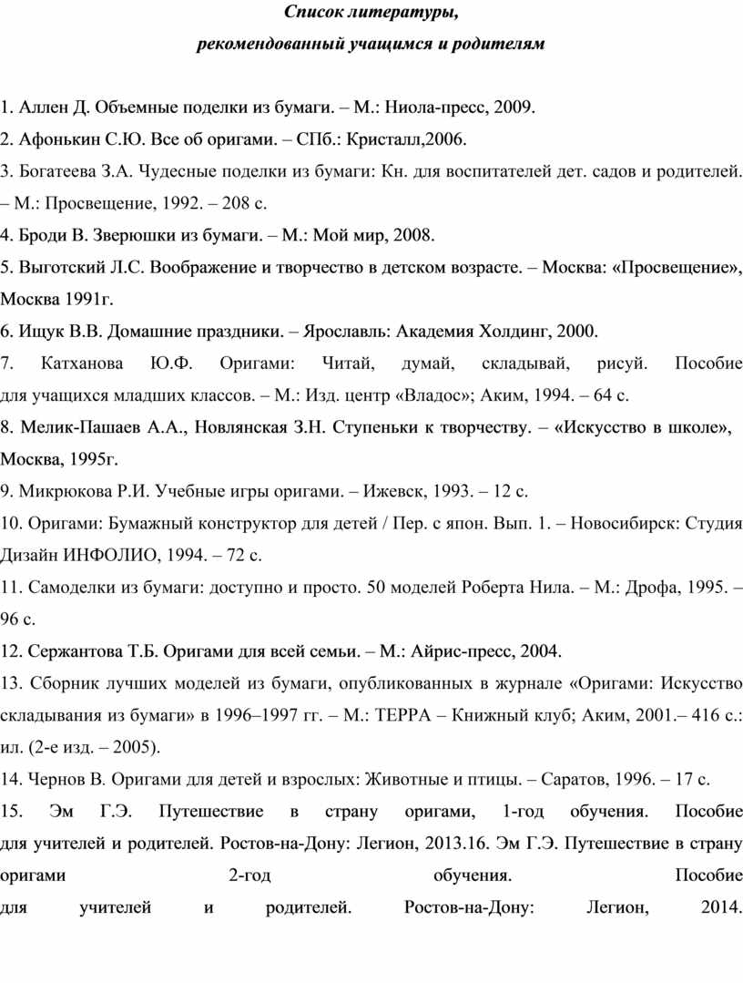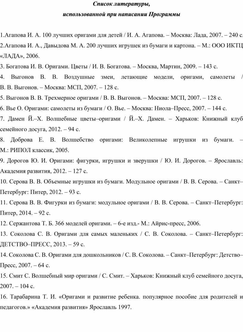 16. Тарабарина Т. И. «Оригами и развитие ребенка. популярное пособие для родителей и педагогов.» «Академия развития» Ярославль 1997.