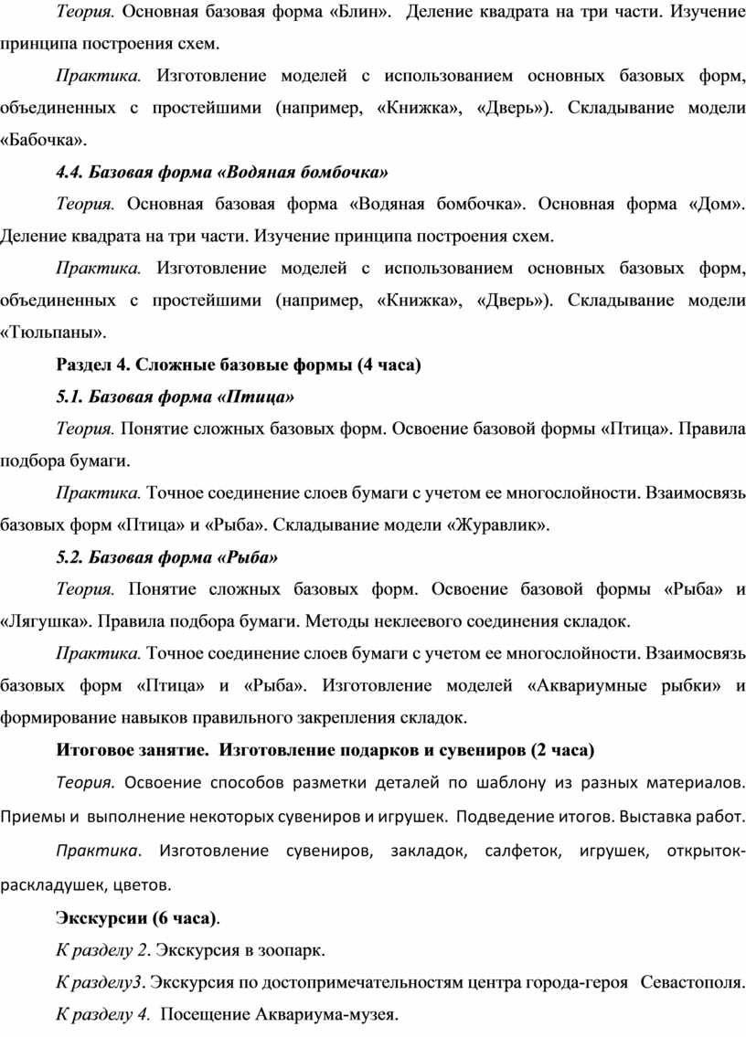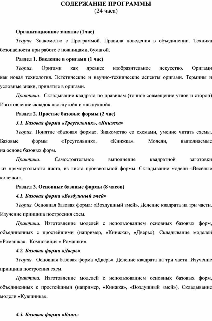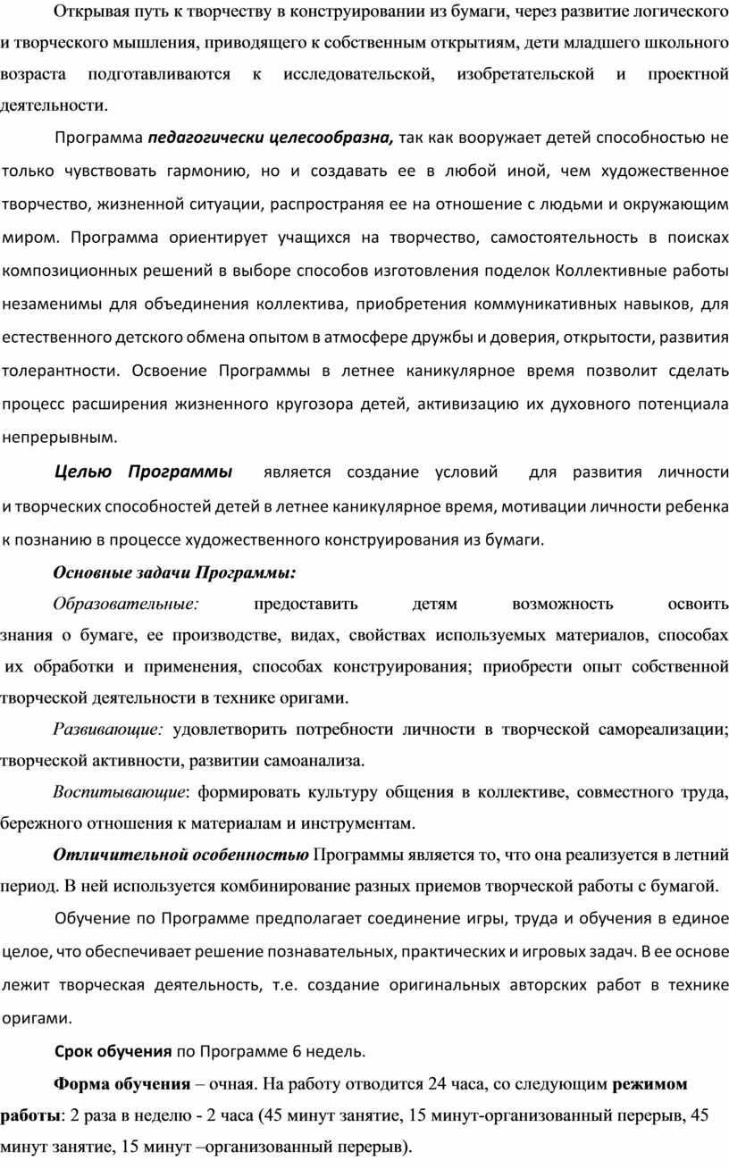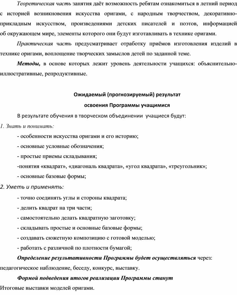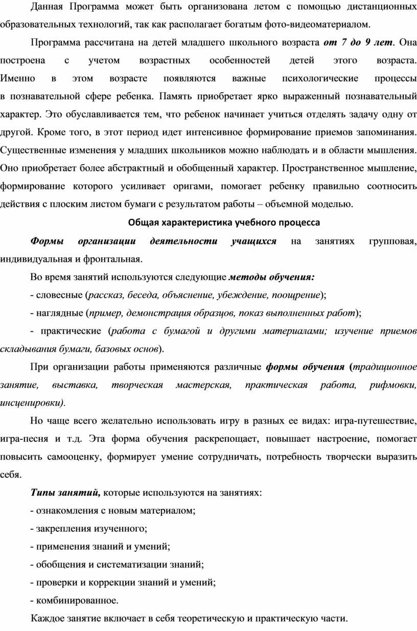 Обучение по Программе предполагает соединение игры, труда и обучения в единое целое, что обеспечивает решение познавательных, практических и игровых задач. В ее основе лежит творческая деятельность, т.е. создание оригинальных авторских работ в технике оригами.