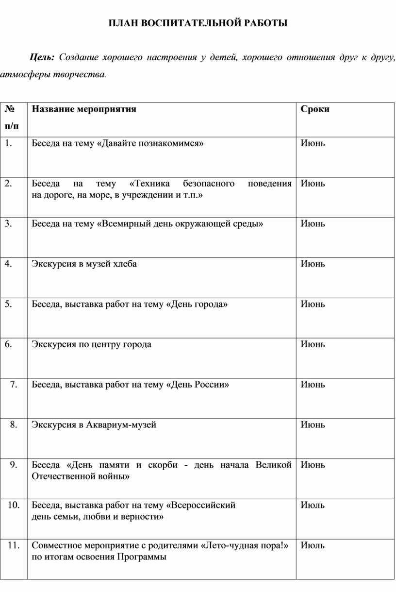 ПЛАН ВОСПИТАТЕЛЬНОЙ РАБОТЫ