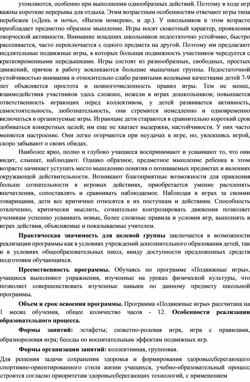 Объем и срок освоения программы. Программа «Подвижные игры» рассчитана на 1 месяц обучения, общее количество часов - 12. Особенности реализации образовательного процесса.