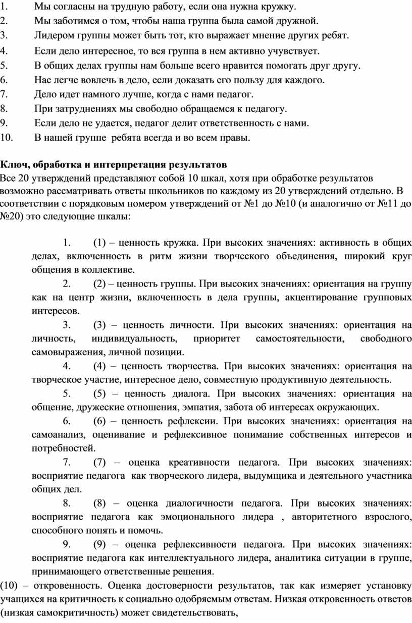 1. (1) – ценность кружка. При высоких значениях: активность в общих делах, включенность в ритм жизни творческого объединения, широкий круг общения в коллективе.