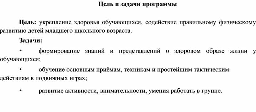 Цель: укрепление здоровья обучающихся, содействие правильному физическому развитию детей младшего школьного возраста.