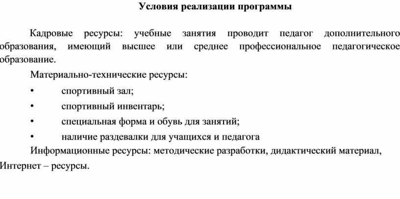 Кадровые ресурсы: учебные занятия проводит педагог дополнительного образования, имеющий высшее или среднее профессиональное педагогическое образование.