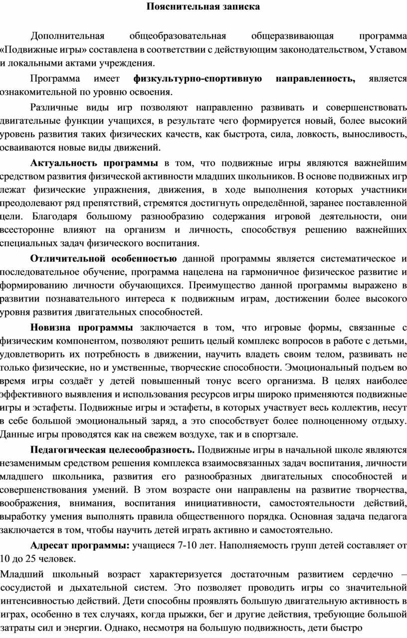 Актуальность программы в том, что подвижные игры являются важнейшим средством развития физической активности младших школьников. В основе подвижных игр лежат физические упражнения, движения, в ходе выполнения которых участники преодолевают ряд препятствий, стремятся достигнуть определённой, заранее поставленной цели. Благодаря большому разнообразию содержания игровой деятельности, они всесторонне влияют на организм и личность, способствуя решению важнейших специальных задач физического воспитания.