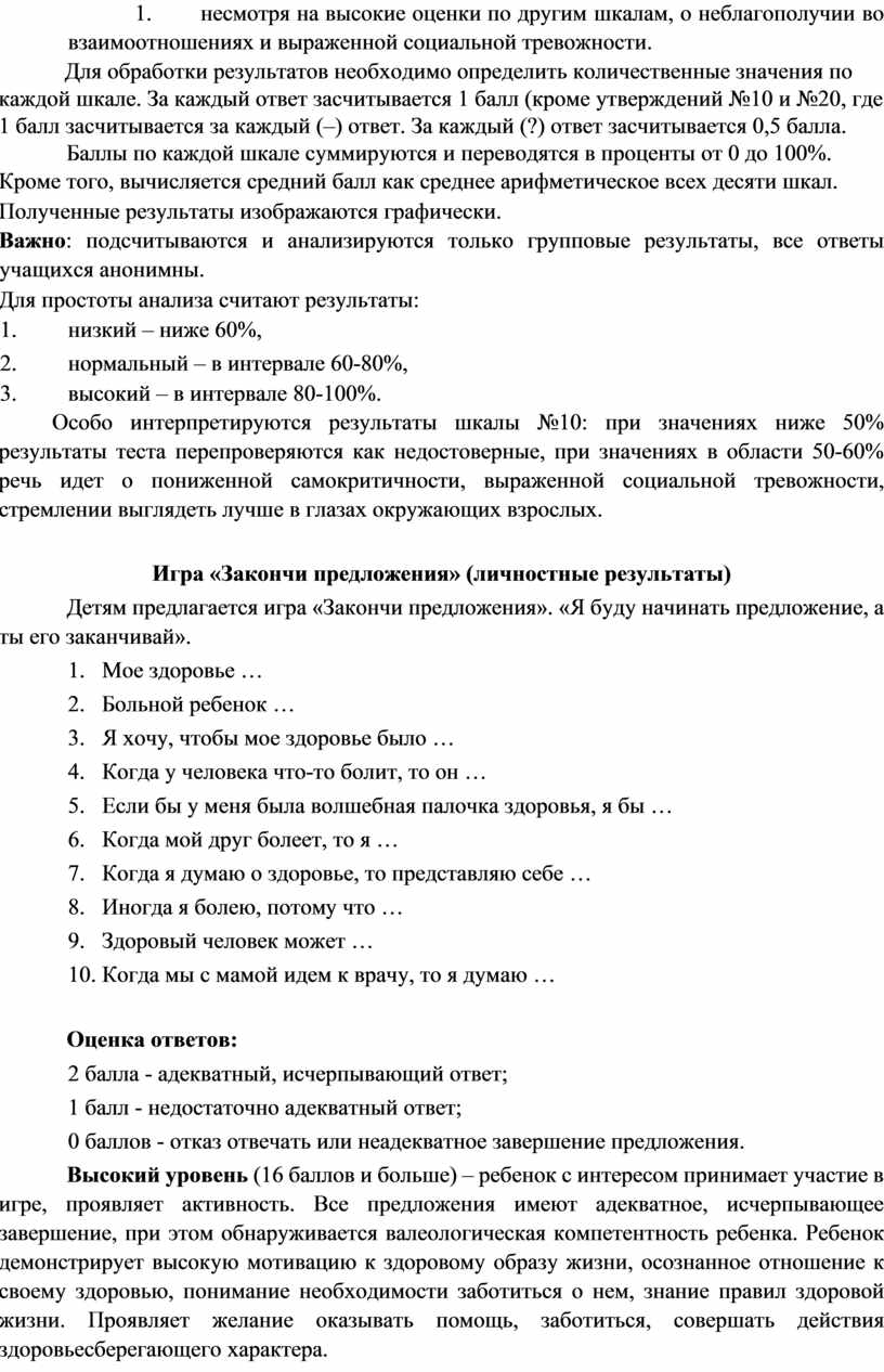 Высокий уровень (16 баллов и больше) ‒ ребенок с интересом принимает участие в игре, проявляет активность. Все предложения имеют адекватное, исчерпывающее завершение, при этом обнаруживается валеологическая компетентность ребенка. Ребенок демонстрирует высокую мотивацию к здоровому образу жизни, осознанное отношение к своему здоровью, понимание необходимости заботиться о нем, знание правил здоровой жизни. Проявляет желание оказывать помощь, заботиться, совершать действия здоровьесберегающего характера.