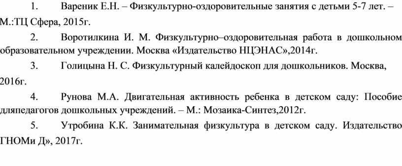 6. Воротилкина И. М. Физкультурно–оздоровительная работа в дошкольном образовательном учреждении. Москва «Издательство НЦЭНАС»,2014г.