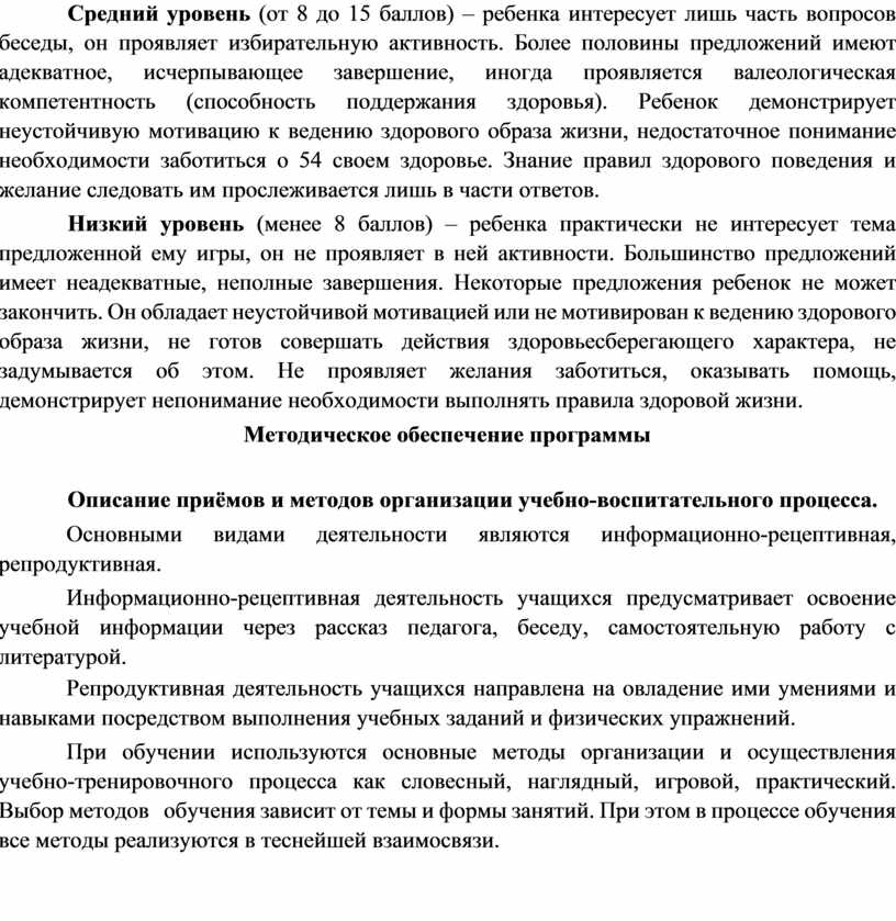 Средний уровень (от 8 до 15 баллов) ‒ ребенка интересует лишь часть вопросов беседы, он проявляет избирательную активность. Более половины предложений имеют адекватное, исчерпывающее завершение, иногда проявляется валеологическая компетентность (способность поддержания здоровья). Ребенок демонстрирует неустойчивую мотивацию к ведению здорового образа жизни, недостаточное понимание необходимости заботиться о 54 своем здоровье. Знание правил здорового поведения и желание следовать им прослеживается лишь в части ответов.