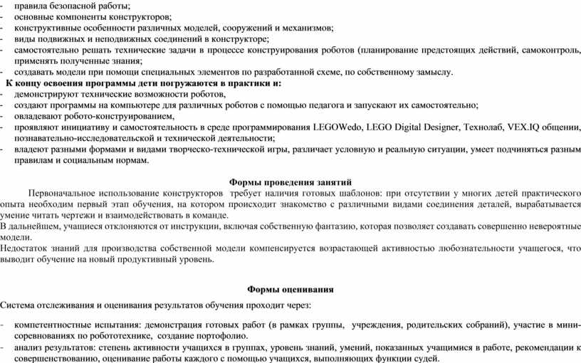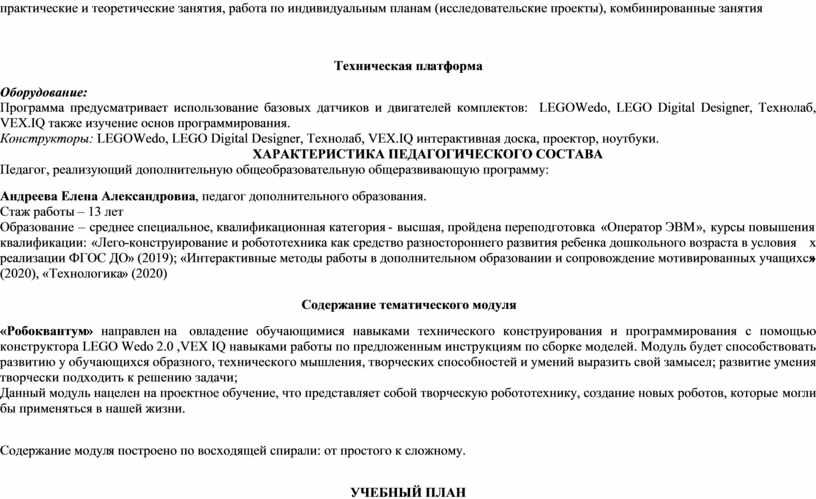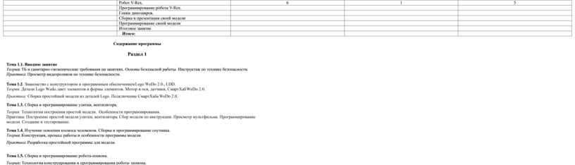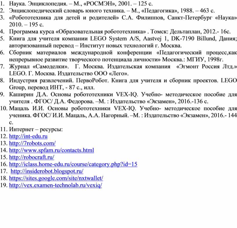 Техническое обеспечение. Для очных занятий: Средства обучения: теоретический кабинет, оборудованный в соответствии с санитарно-гигиеническими требованиями на 15 ученических мест, доска для фломастеров, доступ к сети Интернет, рабочие тетради, наглядные пособия, мультимедийные презентации. Оборудование: Программа предусматривает использование базовых датчиков и двигателей в конструкторах, а также изучение основ программирования. Конструкторы: LEGOWedo, LEGO Digital Designer, Технолаб, VEX.IQ интерактивная доска, проектор, ноутбук Для заочных, дистанционных занятий и самообучения: Персональный компьютер. Операционная система Windows. Установленный браузер. Доступ в интернет. |
