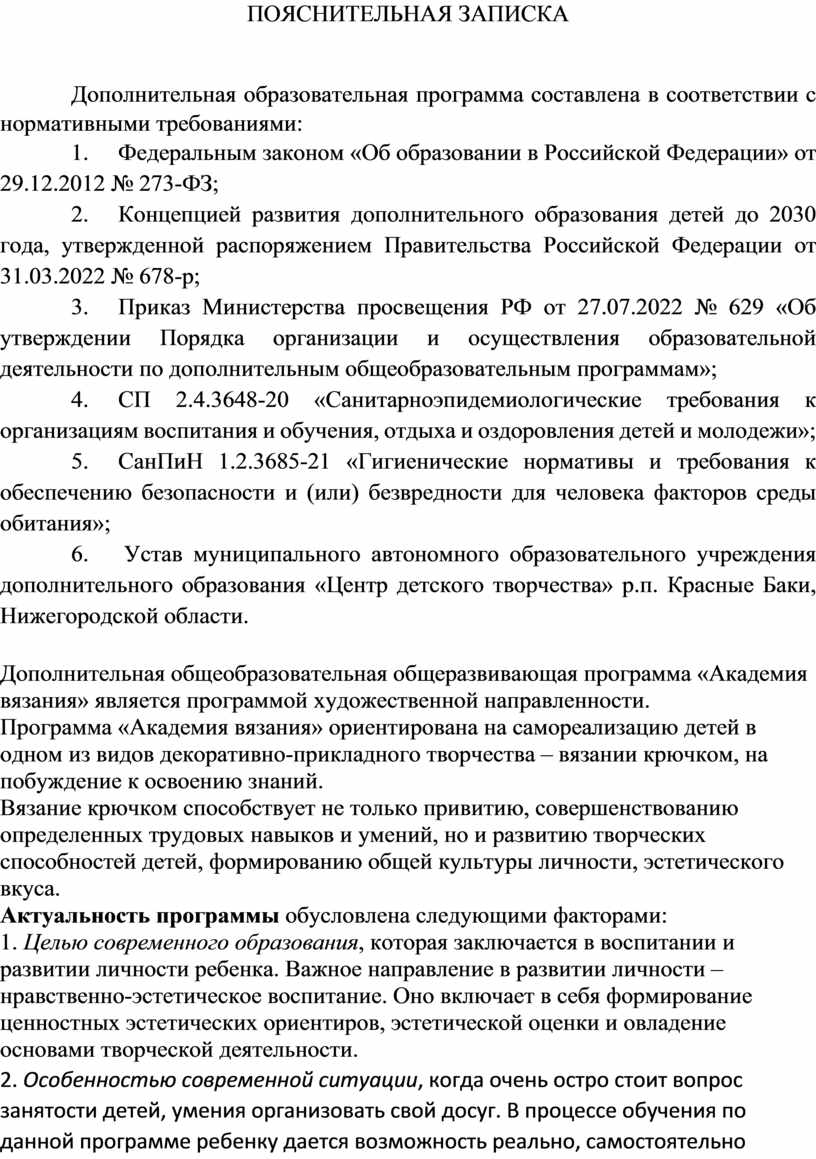 Дополнительная общеобразовательная общеразвивающая программа «Академия вязания» является программой художественной направленности.
