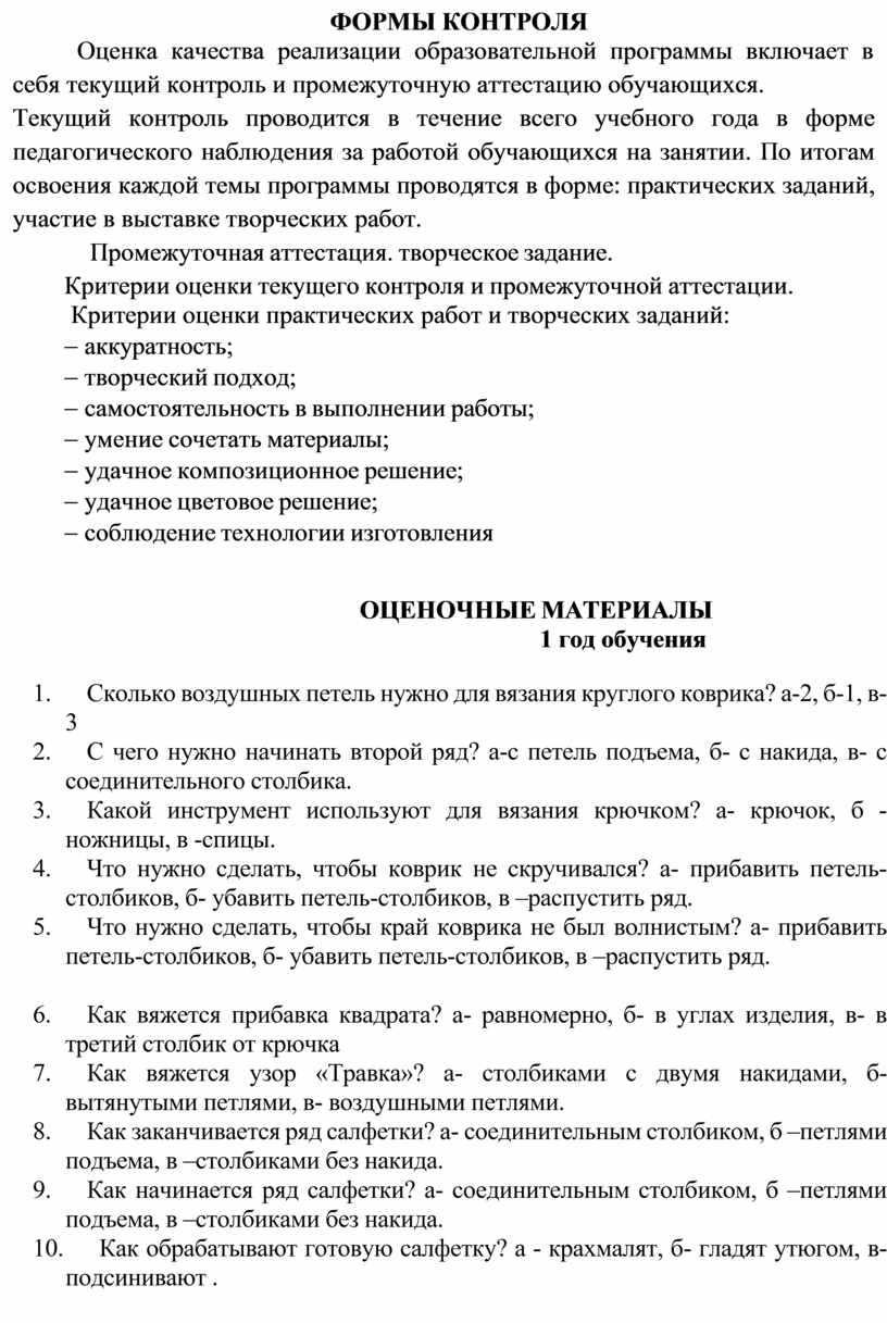 Текущий контроль проводится в течение всего учебного года в форме педагогического наблюдения за работой обучающихся на занятии. По итогам освоения каждой темы программы проводятся в форме: практических заданий, участие в выставке творческих работ.