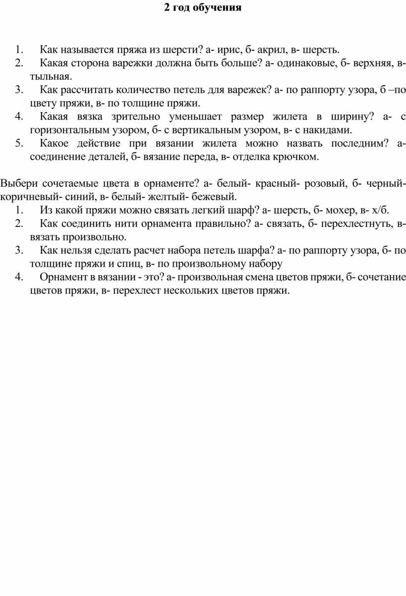 1. Как называется пряжа из шерсти? а- ирис, б- акрил, в- шерсть.