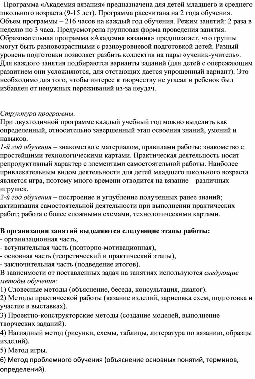 Программа «Академия вязания» предназначена для детей младшего и среднего школьного возраста (9-15 лет). Программа рассчитана на 2 года обучения.