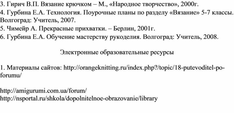 4. Гурбина Е.А. Технология. Поурочные планы по разделу «Вязание» 5-7 классы. Волгоград: Учитель, 2007.