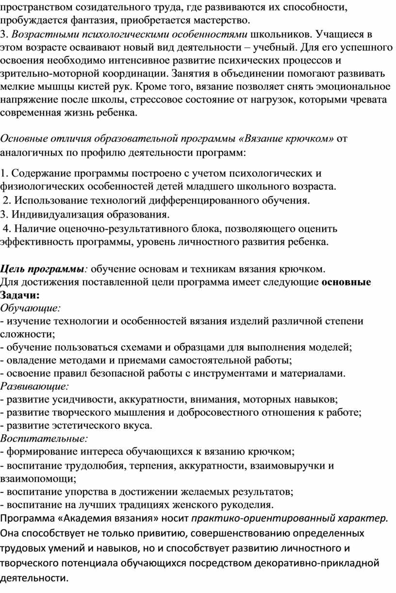 Программа «Академия вязания» носит практико-ориентированный характер. Она способствует не только привитию, совершенствованию определенных трудовых умений и навыков, но и способствует развитию личностного и творческого потенциала обучающихся посредством декоративно-прикладной деятельности.