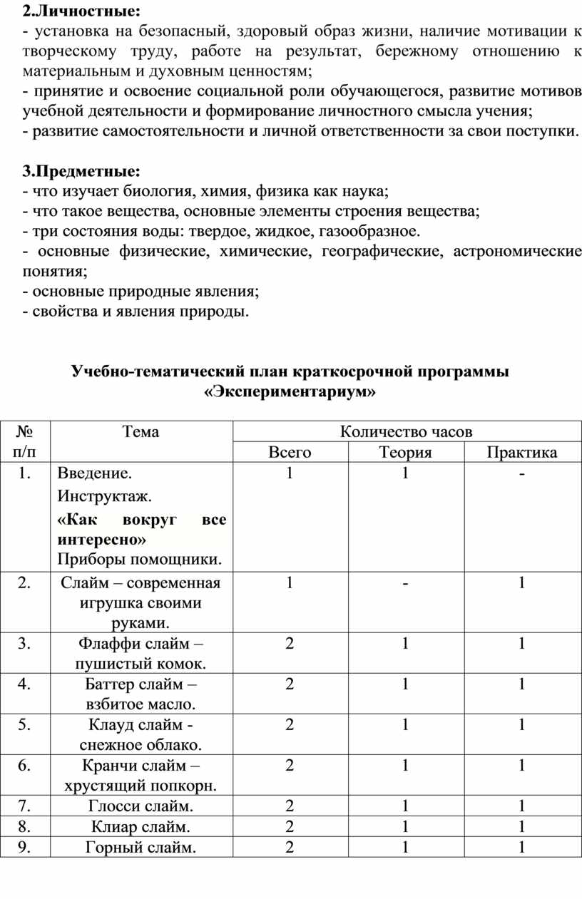 Учебно-тематический план краткосрочной программы «Экспериментариум»