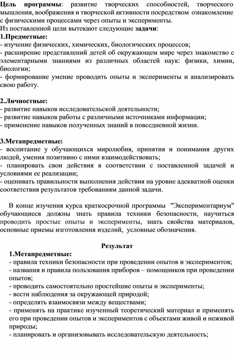 В конце изучения курса краткосрочной программы "Экспериментариум" обучающиеся должны знать правила техники безопасности, научиться проводить простые опыты и эксперименты, знать свойства материалов, основные приемы изготовления изделий, условные обозначения.