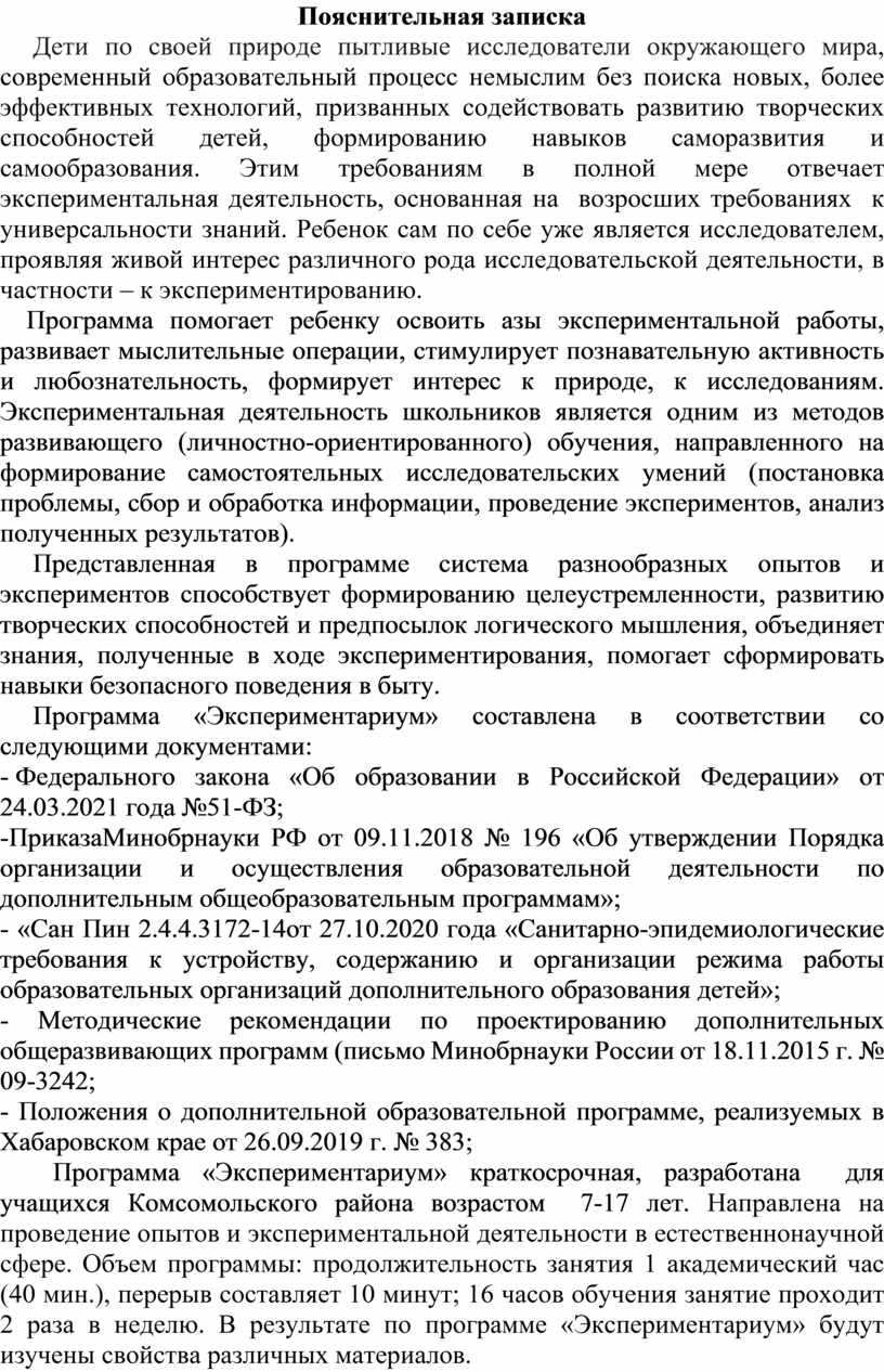 Программа «Экспериментариум» составлена в соответствии со следующими документами: